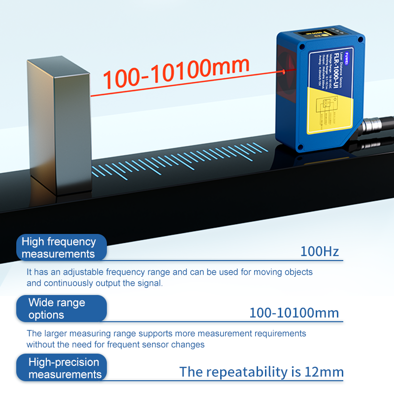 FLR-1000-UI: n korkeataajuinen mittauskyky on todella poikkeuksellinen, mittaustaajuus on jopa 100Hz ja säädettävä taajuusalue. Tämä ominaisuus antaa sille mahdollisuuden hankkia etäisyystiedot nopeasti ja tarkasti liikkuvien objektien käsittelemisessä, signaalien jatkuvasti tuottamalla saumattoman mittausprosessin ja luotettavien tietojen varmistamiseksi, välttäen tehokkaasti objektin liikkeen aiheuttamia mittausviiveitä tai tietojen menetystä.