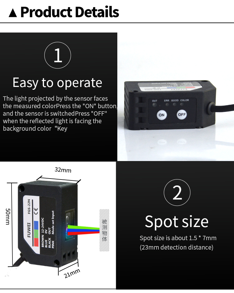 3. Millimetrin tason tarkkuuskaappaus 1,5 × 7 mm Suorakulmainen valonpisteen suunnittelu (23 mm: n havaitsemisetäisyys).
