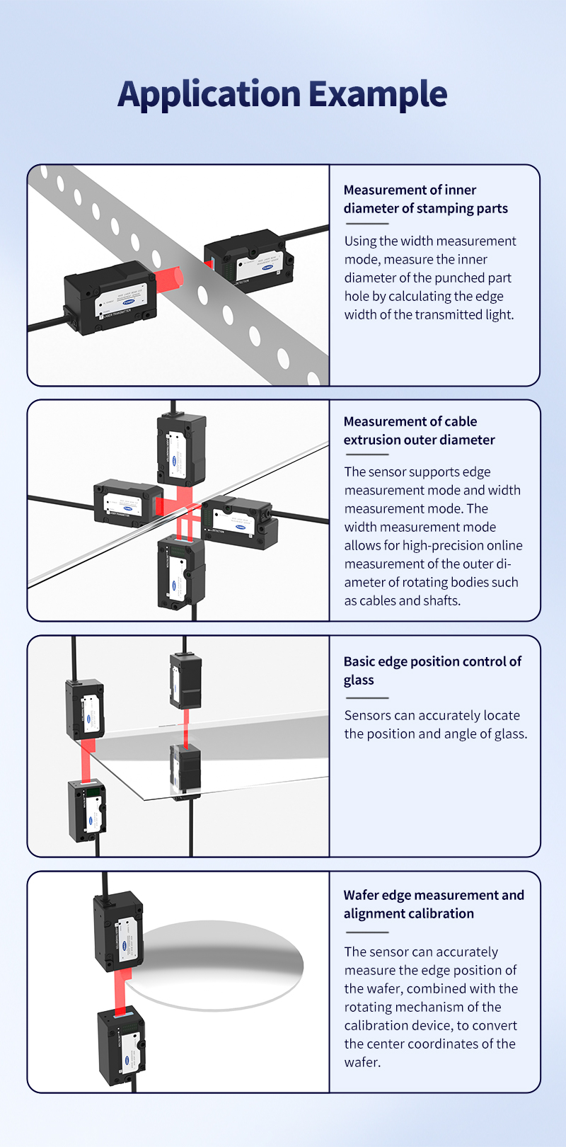 Kaapelin suulakepuristus O.D. Valvonta: Kaapelin tuotantolinjassa anturi kaappaa dynaamisesti O.D. Vaihda 500 Hz: n näytteenottotaajuudella ja yhdistää saumattomasti PLC: n kanssa Modbus-protokollan kanssa suljetun silmukan ohjauksen toteuttamiseksi ja materiaalin jätteiden vähentämiseksi.