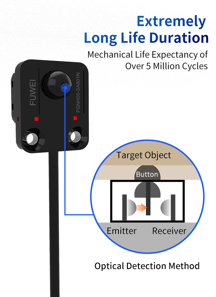 Teollisuuslaitteiden käyttöikä vaikuttaa suoraan tuotannon jatkuvuus- ja ylläpitokustannuksiin. FGNH09-SA801N: n mekaaninen elinikä on yli 5 miljoonaa toimintaa, mikä ylittää alan keskiarvon huomattavasti. Tämä luku tarkoittaa, että jos laite kulkee 10 tuntia päivässä 1 sekunnin välein kunkin havaitsemisoperaation välillä, se voi toimia jatkuvasti ja vakaasti lähes 17 vuoden ajan, mikä vähentää merkittävästi anturin korvaamisen taajuutta.