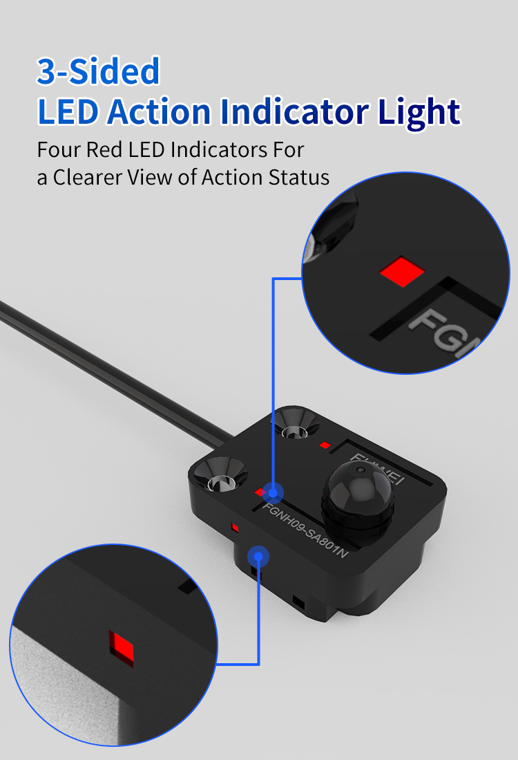 Kiireisessä tuotantopaikassa, vaikuttaako anturin työtila selvästi operaattoreiden arviointehokkuuteen. FGNH09-SA801N: ssä on innovatiivisesti 3-puolen LED-toimintaindikaattorit: 2 sivuilla ja 2 yläosassa, yhteensä 4 punaisen LED-helmiä. Tämän asettelun avulla operaattorit näkevät selvästi indikaattorien on/pois-tilan laitteen edestä, sivusta tai yläosasta ja seurata anturin toimintaolosuhteita reaaliajassa.