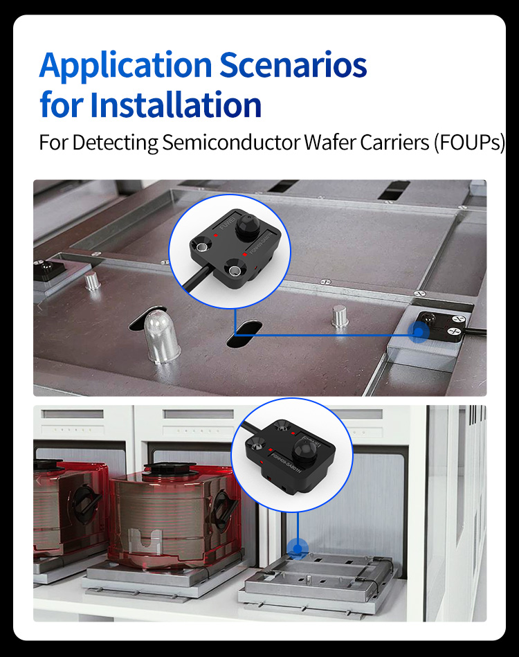 Olipa kompakti puolijohdelaitteita vai avointen tuotantolinjojen vieressä, voidaan korjata nopeasti, lyhentämällä laitteita virheenkorjausaikaa. Puolijohde -kentällä lähettäminen luotettavampaan Foup -havaitsemiseen puolijohdevalmistukseen, kiekkojen kuljettajien (FOUP: ien) läsnäolon havaitseminen varmistaa kiekkojen kuljetusten turvallisuus. FGNH09-SA801N-painiketyyppinen muotoilu sopii täydellisesti Foup-havaitsemisskenaarioihin: sen kompakti koko voidaan upottaa kapeaan laitetilaan tarkasti havaitakseen, onko FOUP paikallaan; Sen all-aiheen havaitsemiskyky varmistaa vakaan vasteen FOUP: n eri osiin, kuten muovikuoret ja metallisolkut; ja sen erittäin pitkä elinikä ja korkea stabiilisuus täyttävät suuren puhtauden ja jatkuvan toiminnan tiukat vaatimukset puolijohdepajoissa.