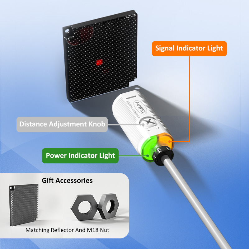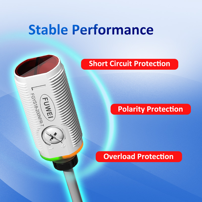 FGYS18-200NFR-T ammattimainen läpinäkyvän pullon tunnistusanturi hyödyntää kehittynyttä linssin heijastusperiaatetta ja päällystettyä optista suodatintekniikkaa, joka ratkaisee tehokkaasti läpinäkyvän astian havaitsemiseen liittyvät haasteet. Siinä on 2 metrin säädettävä tunnistusalue, jossa on näkyvä punainen valopiste tarkkaan paikannukseen. Varustettu kolminkertaisilla suojamekanismeilla (oikosulku, käänteinen napaisuus ja ylijännite) ja kvartsilinssillä, joka kestää lämpömuodonmuutoksia, ja se varmistaa vakaan optisen anturin läpinäkyvän objektin tunnistus Peilin heijastuksen M18 2 m:n tunnistusetäisyyden sylinterimäinen anturi tekee luotettavan valinnan ankarissa teollisuusympäristöissä, automaattisella häiriönkestävällä tuotantolinjalla.